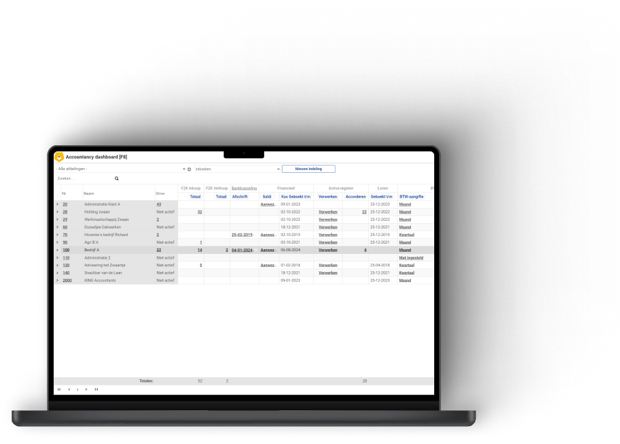 KING Accountancy is een compleet en flexibel accountancypakket voor administratie- en accountantskantoren. Werk in één centrale omgeving voor al je klanten, automatiseer terugkerende processen en houd grip op kwaliteit, controle en efficiëntie. Werk samen met je klanten in dezelfde administratie, stuur op uitzonderingen en houd tijd over voor advies.