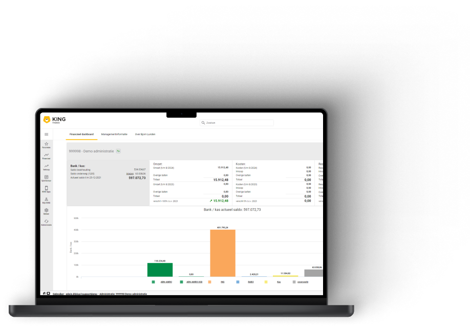Of je nu ondernemer of accountant bent: met KING werk je in één moderne online omgeving die meebeweegt met jouw manier van werken. Als ondernemer heb je met KING Finance realtime inzicht en grip op je cijfers. Ben je accountant of run je een administratiekantoor? Met KING Accountancy werk je als accountant efficiënt samen met al je klanten. Slim, veilig en volledig online, zodat jij minder tijd kwijt bent aan administratie en meer tijd overhoudt voor ondernemen en adviseren.