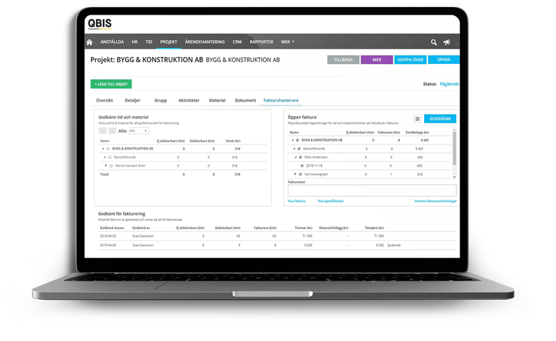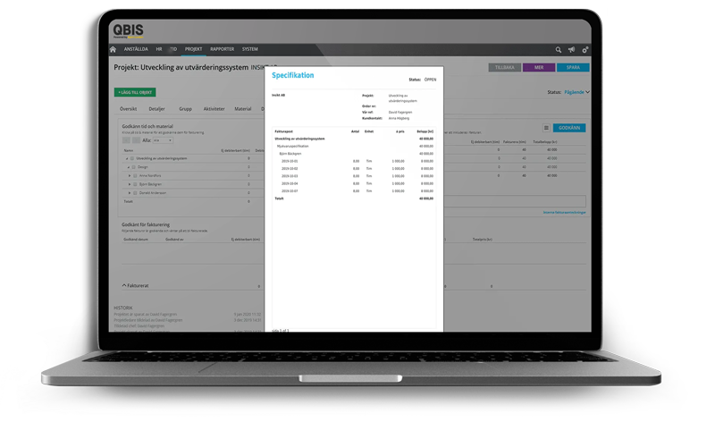 Skapa fakturaunderlag som innehåller all nödvändig information inför faktureringen. Med inrapporterad projekttid anges dessutom om den är debiterbar eller inte debiterbar. Material och andra inköp specificeras i den automatiska fakturaspecifikation som genereras från QBIS, så att du snabbt kan importera underlaget till faktureringsprogrammet.