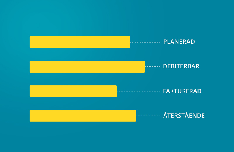 Faktureringsöversikten ger god inblick i hur projektet har planerats gentemot vad som har gjorts ur faktureringsperspektive. I form av staplar indikerar faktureringsöversikten den kostnadsmässiga budgeten, hur mycket tid som är debiterbar i projektet, hur mycket som dittills har lämnats över för fakturering samt hur mycket som återstår att fakturera.
