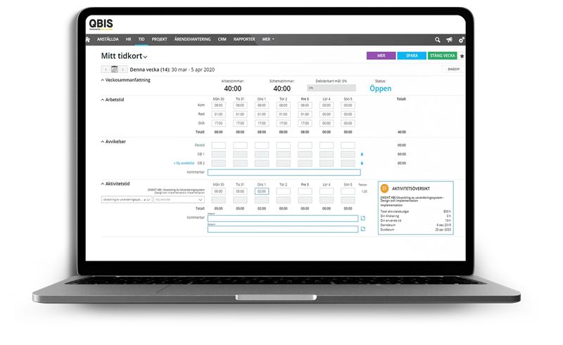 Projektmedlemmar rapporterar sin tid mot projektaktiviteter som finns inlagda i projektet. Tiden som registreras kommer automatiskt att mätas gentemot budget, kostnad och pris i projektets inställningar. På så sätt kommer aktuellt faktureringsunderlag finnas i projektöversikten